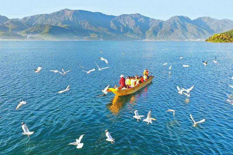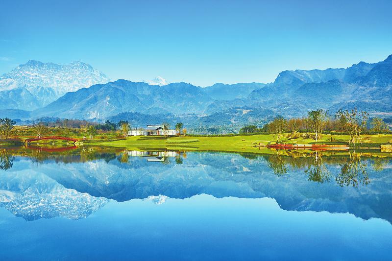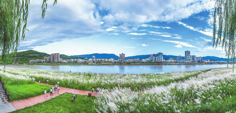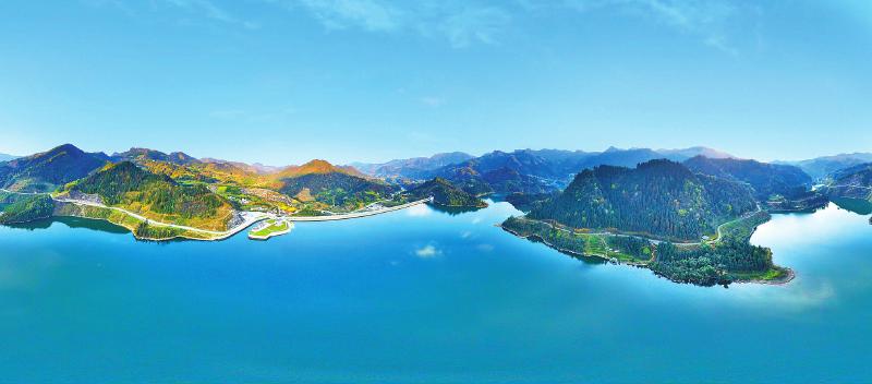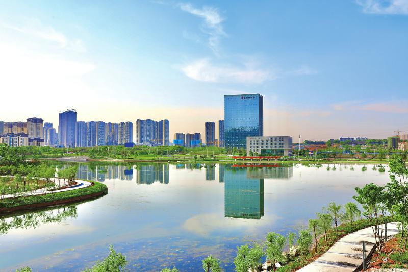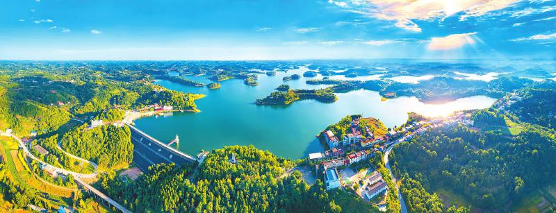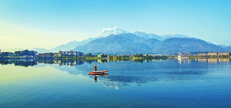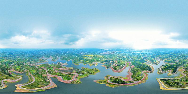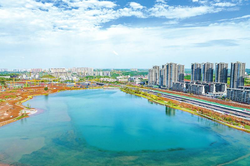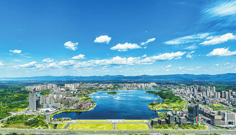 兴隆湖全景,远处是龙泉山。如今沿湖区域已构建出公园城市“宜居、宜业、宜创、宜学、宜养”的幸福场景。 马骥 摄
