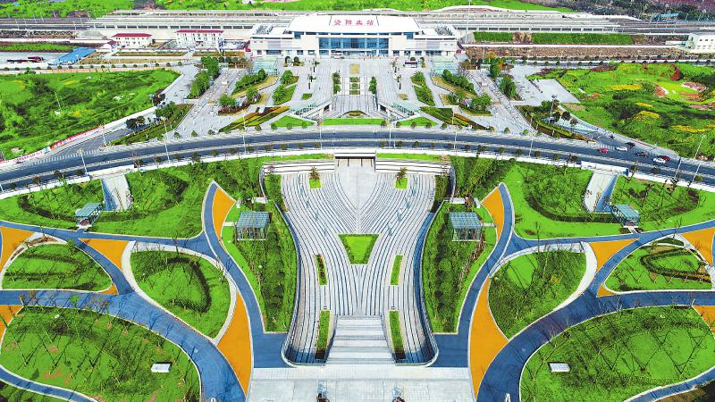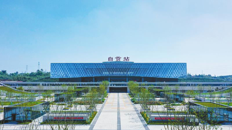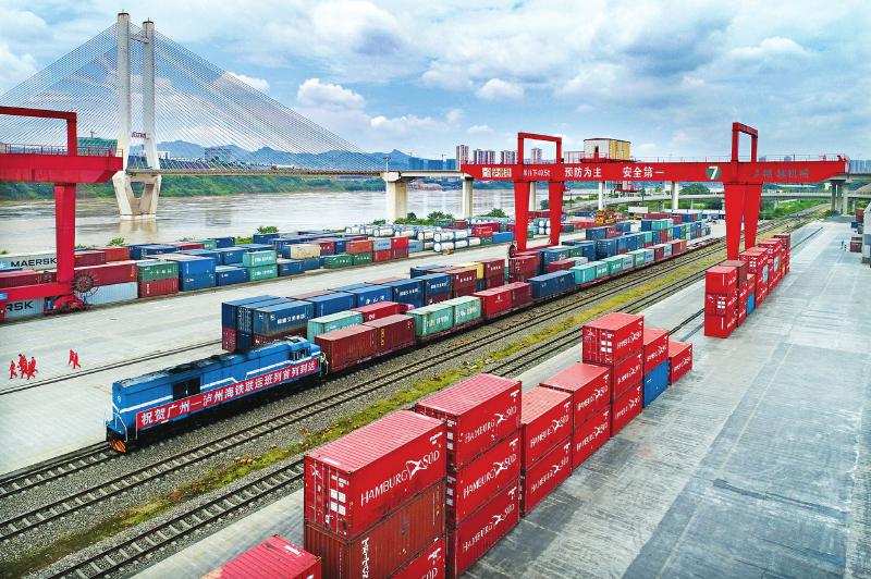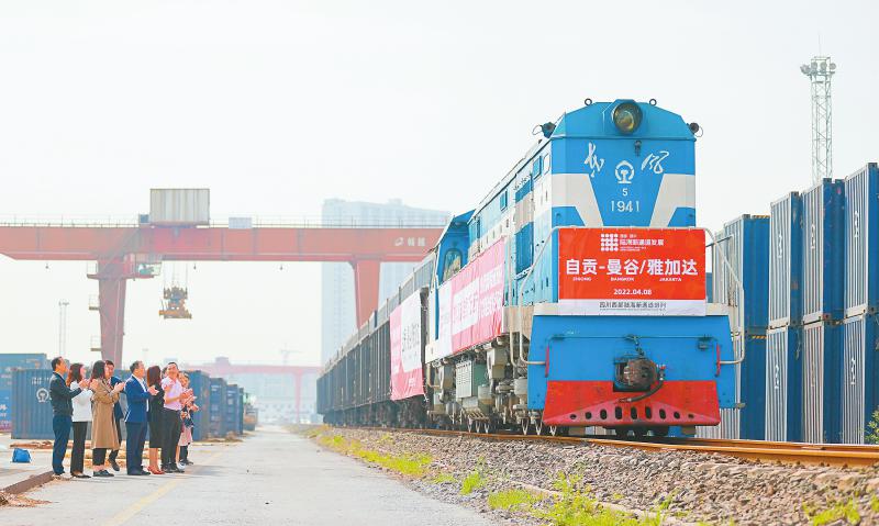 2022年4月8日,四川西部陆海新通道班列从自贡南站驶出。