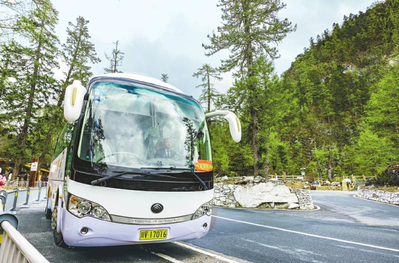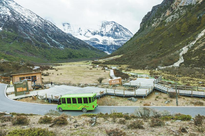 景区观光车在整洁的道路上接送游客。 洛绒尼玛 摄
