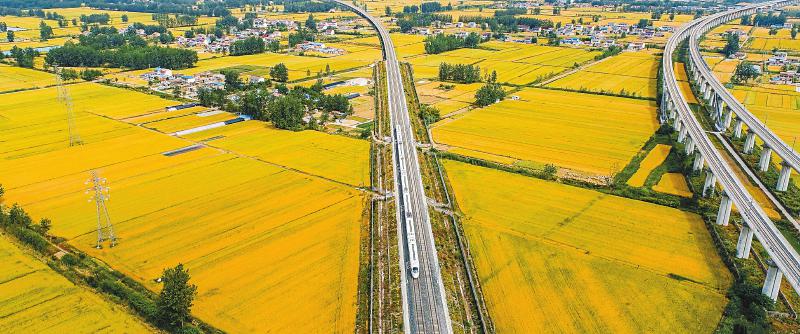 5月26日,一列高铁列车驶过江苏淮安即将丰收的麦田(无人机拍摄)。小满已过,芒种将至,江苏省淮安市470余万亩小麦长势良好,即将开镰收割。 新华社发(赵启瑞 摄)