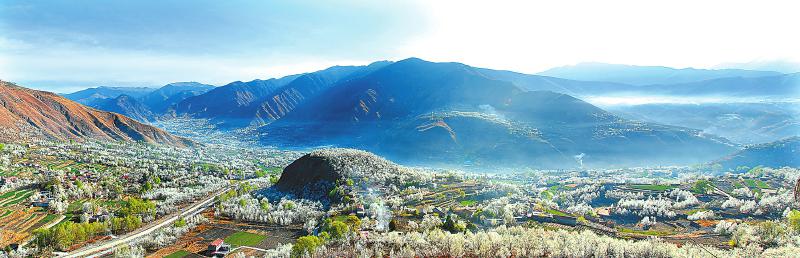 金川县万亩梨花绽放,雪白的梨花与蓝天、白云、民居、碉楼共同绘出一幅“世外梨园”的美景,绵延百余公里。 (金川县委宣传部供图)