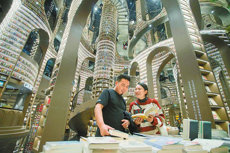 2020年10月9日,读者在都江堰钟书阁书店里阅读。这间书店因奇特、创新的设计被众多读书爱好者追捧。截至2021年,成都实体书店和阅读空间超过3600家,居全国第一。