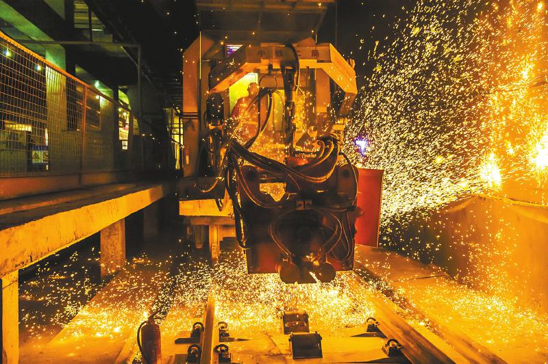攀钢轨梁厂万能一线轧机在轧制钢轨。 何仁江 摄