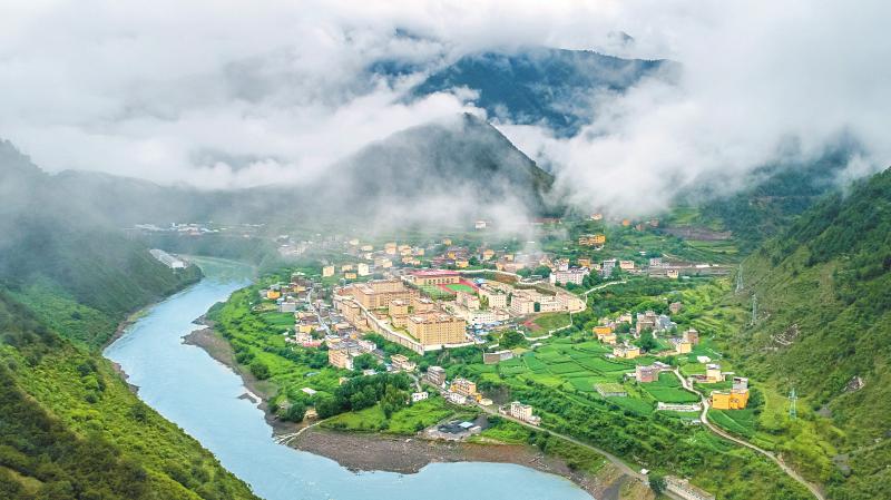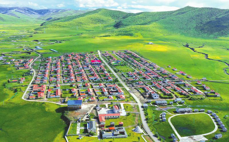 2019年5月29日,鸟瞰阿坝州红原县玛萨村。村里易地搬迁的房屋整齐地坐落在道路两旁,在初夏阳光的映照下,这个旧貌焕新颜的村庄显得安静而祥和。