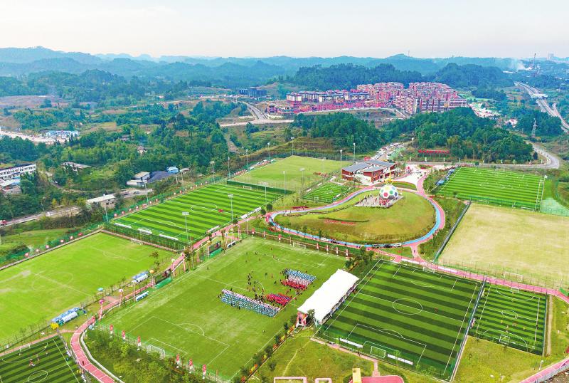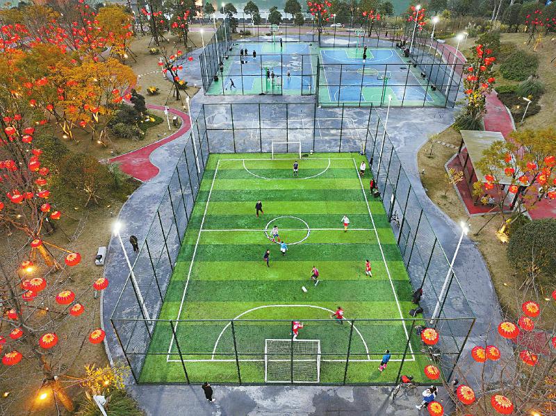 2022年2月7日傍晚,市民在位于宜宾市翠屏区岷江桥北桥头的锁江石公园运动场踢足球、打篮球。这个集健身、休闲、观景等于一体的公园是翠屏区结合老旧小区改造新建的“口袋”公园。