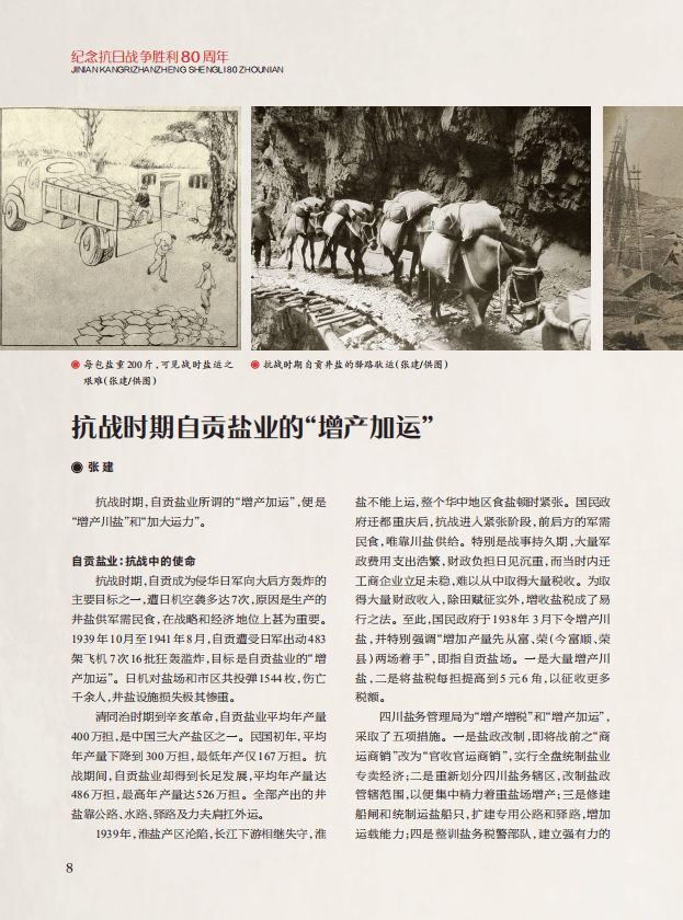 “纪念抗日战争胜利80周年”为2025年特设专栏。2025年是中国人民抗日战争暨世界反法西斯战争胜利80周年。为铭记历史,弘扬伟大的爱国主义精神、伟大抗战精神,从中汲取开创未来的精神和力量,本期特开设“纪念抗日战争胜利80周年”专栏。专栏刊发《抗战时期自贡盐业的“增产加运”》《乐山人民对抗战胜利的贡献》《戎州燃热血浩气映长天——抗日战争中的宜宾》《柔肩担兴亡素手挽山河——四川妇女在大后方投身抗战的五个历史片段》《音乐家沙梅抗日救亡的历史功绩》《前线浴血卫山河 后方倾力固根基——从四川省志看四川在抗日战争中的巨大贡献》6篇文章。从不同角度讲述在那段艰难的岁月里,作为抗战大后方的四川,无惧敌人惨无人道的大轰炸,以全省之人力、物力、财力支援全国抗战。在战场上浴血奋战、保家卫国,在大后方坚忍不屈、慷慨奉献。无论是物质支援还是精神贡献,都体现了川人的坚韧不屈和担当奉献。通过回顾这些历史事件,讲述其背后的故事,讴歌川军抗日的悲壮和惨烈,展示四川人民在反法西斯战争中的英雄业绩,彰显伟大的抗战精神,凝聚团结奋进的力量。