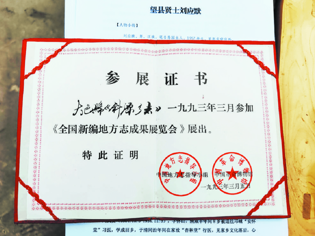 终于,《斜源乡志》在1987年成书出版了。这本由11个篇章、15余万字架构而成的“乡志”填补了斜源乡长期以来的地方志空白。1993年,该书荣获中国地方志指导小组、中国革命博物馆《全国新编地方志成果博览会》颁发的证书并被展出、收录。此后刘应默陆续完成了《大邑饮食民俗志》《增补中国民俗志·大邑县卷》,并撰写了大邑第一部村级志书《成都市大邑县斜源镇·江源村志》,于2015年出版。