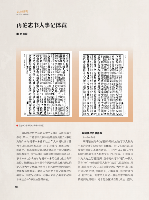 司马迁在完成《史记》的同时,创立了以人物为中心的完备的纪传体史书体裁。自《史记》之后,班固等史学家无不竞相效仿,二十四史以及《新元史》《清史稿》毫无例外地都采用了纪传体。纪传体是以为人物立传记(通常,皇帝的传记称“纪”,一般人的称“传”,特殊情形的人物称“载记”,记载制度、风俗、经济等称“志”,以表格排列历史大事称“表”)的方式记叙史实,规模宏大,记事详备,往往贯通古今、包罗万象。而志书大事记一般是在志书断限内按时间先后顺序,对本行政区域自然、政治、经济、文化和社会等方面的大事、要事做准确而简要的记述。这与为人物立传有本质上的区别,因此纪传体无法也不可能成为志书大事记的体裁。