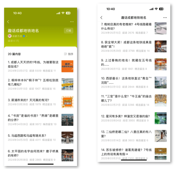 我们关注地名文化。在地名文化中,聚焦于与市民出行紧密相关的地铁。目前成都轨道交通运营里程突破758.245公里,覆盖18条线路(含资阳线、有轨电车),共489座车站,日均客运量615万。2024年3月,“成都方志”微信公众号开设“趣话成都地铁地名”专栏(,刊发文章20篇,从地铁1号线到10号线,逐一梳理市民耳熟能详的站名。