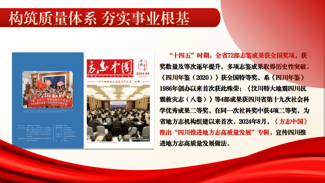 (二)构筑质量体系,夯实事业根基。质量是立业之本。我们充分认识到,地方志作为官书,传之千秋万代,志鉴质量高低决定地方志工作的兴衰成败,始终把质量建设放在工作首位,提出对党和国家负责、对人民负责、对历史负责“三个负责”理念,逐步建立并完善以《关于实施地方志工作质量提升行动的意见》《关于推进地方志事业高质量发展的意见》为重要指引,以“精品志鉴、史志期刊、地情文献、网络媒体、文化宣传、活动场馆、资政辅治”“七大品牌建设”为重要内容,以省志、市县志、综合年鉴质量体系建设纲要,乡镇(街道)、村志编纂规范等为重要支撑,以地方综合年鉴编纂篇目审查与复核、质量抽查与通报为重要措施,体系化、规范化、标准化推进质量建设。“十四五”时期,全省72部志鉴成果获全国奖项,获奖数量及等次逐年提升,多项志鉴成果取得历史性突破。《四川年鉴(2020)》获全国特等奖,系《四川年鉴》1986年创办以来首次获此殊荣;《汶川特大地震四川抗震救灾志(八卷)》等4部成果获四川省第十九次社会科学优秀成果二等奖,在同一次社科奖中获4项二等奖,为省地方志机构组建以来首次。2024年8月,《方志中国》推出“四川推进地方志高质量发展”专辑,宣传四川推进地方志高质量发展做法。