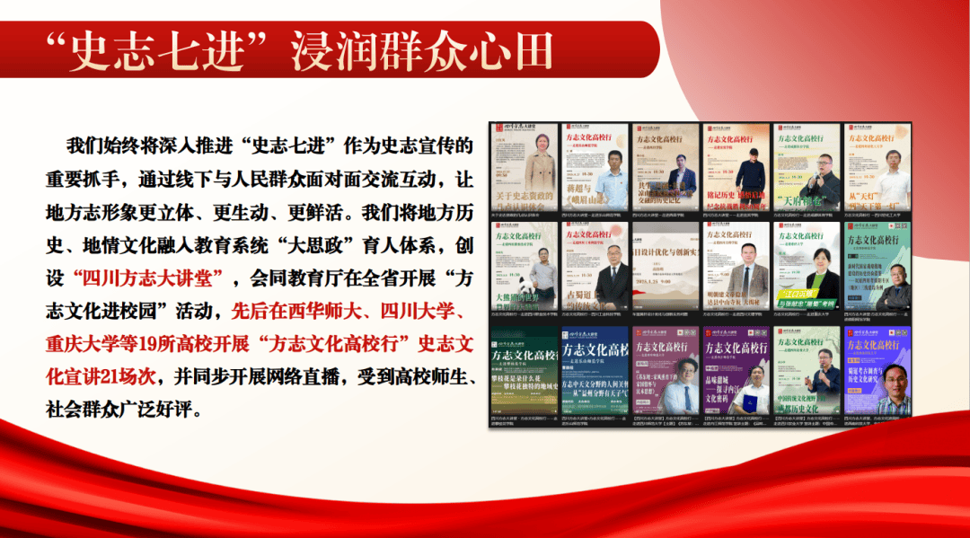 (三)“史志七进”浸润群众心田。我们始终将深入推进“史志七进”作为史志宣传的重要抓手,通过线下与人民群众面对面交流互动,让地方志形象更立体、更生动、更鲜活。我们将地方历史、地情文化融入教育系统“大思政”育人体系,创设“四川方志大讲堂”,会同教育厅在全省开展“方志文化进校园”活动,先后在西华师大、四川大学、重庆大学等19所高校开展“方志文化高校行”史志文化宣讲21场次,并同步开展网络直播,受到高校师生、社会群众广泛好评。举办两届大学生地方志知识竞赛,2.6万余名大学生踊跃参赛;成都举办寻找“蓉城红领巾小史官”“志成都·知未来”方志进高校等活动,吸引超百万大中小学生和家长参加;联合成都市教育科学研究院组织开展“蓉城方志好课”建设,将方志好课讲师及课件纳入全市“城市共享课堂”。“十四五”时期,我们在抓好“方志文化进校园”的同时,抓住重大主题、重大节庆、社会热点等节点,同步抓好进机关、进企业、进社区等活动,切实让方志成果、方志文化走进社会各领域,地方志以文化人、以文育人、以文培元的独特价值得到充分彰显。