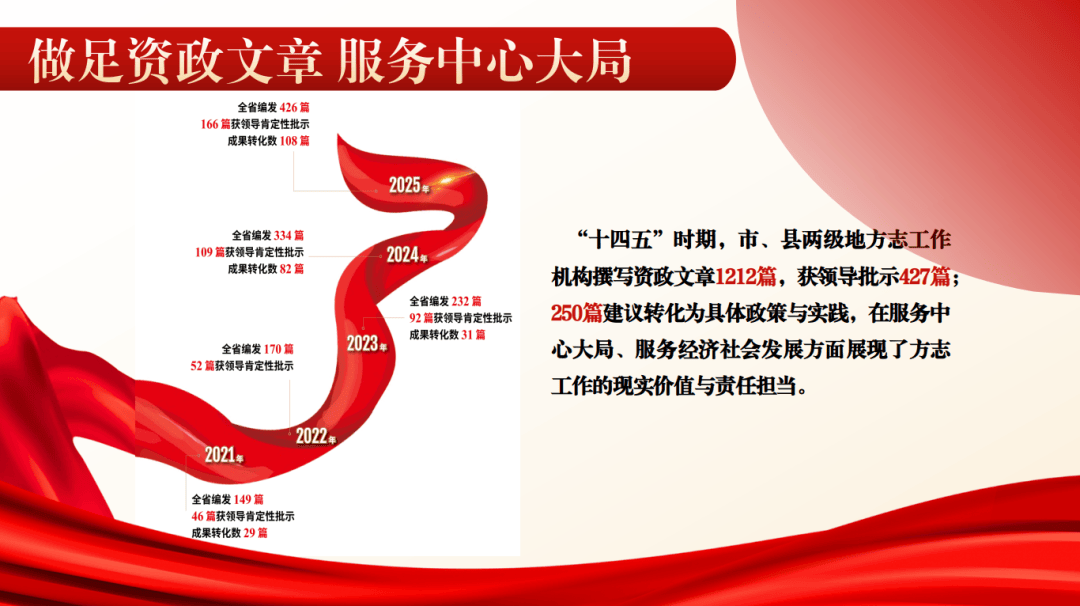 (三)做足资政文章,服务中心大局。盛世修志,贵在致用。我们立足“以史鉴今、以史资政”,创办《资政参阅》,围绕发展大局、社会关切等重大课题,整合全省地方志系统、各相关部门及社会力量,联合撰写针对性强、时效性高的资政文章,呈送各级领导及相关部门,为党委政府决策提供智力支持。“十四五”时期,我们编发《资政参阅》99期,获省长施小琳等省领导肯定性批示37次。加强蜀道古柏保护与开发利用的建议得到省委省政府肯定。加快推进四川三线建设旧址集中保护和利用等相关建议被省人大、省委宣传部、经济和信息化厅等采纳。参与省人大《四川三线建设的历史经验及其对建设国家战略腹地的启示》课题,助力文化遗产保护传承。内江资政专报助力内江市获得“中国甜食之都”称号,宜宾“以宜宾南向影响历史为鉴,加快宜宾现代化区域中心城市建设”建议得到转化落实,凉山推进长征国家文化公园(凉山段)建设的建议获州委书记、州长签批。“十四五”时期,市、县两级地方志工作机构撰写资政文章1212篇,获领导批示427篇;250篇建议转化为具体政策与实践,在服务中心大局、服务经济社会发展方面展现了方志工作的现实价值与责任担当。