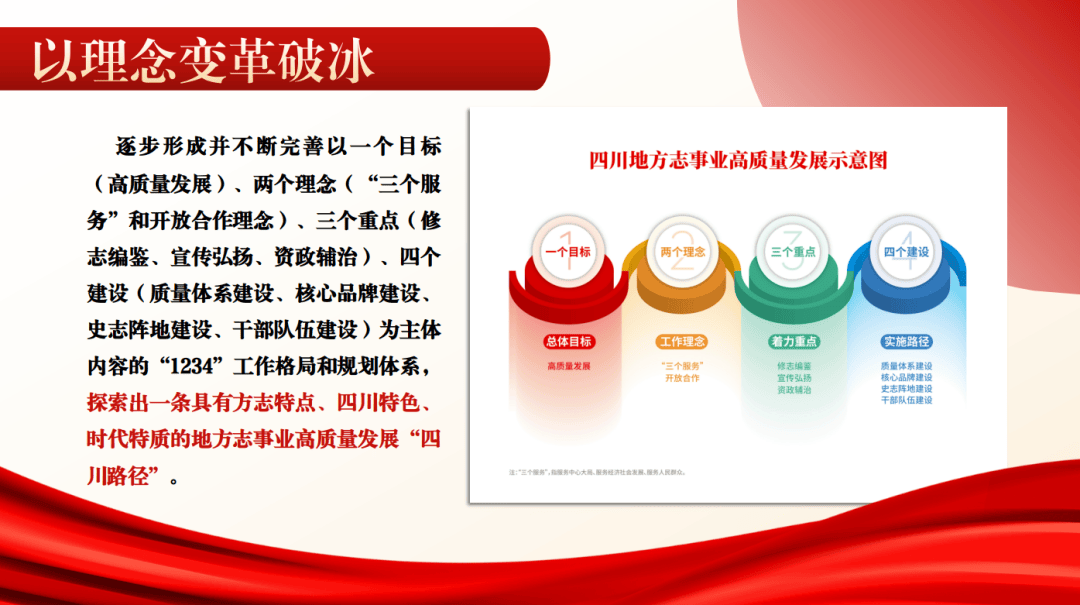 (二)以理念变革破冰。理念革新是地方志事业高质量发展的动力源泉。面对长期以来形成的“闭门修志”“一本书主义”等惯性思维,我们坚持思想打头、理念先行,鲜明提出服务中心大局、服务经济社会发展、服务人民群众“三个服务”工作理念。“观念一变天地宽”。立足地方志“三个服务”理念的导向定位,我们先后提出“志鉴编纂是立业之基,开发利用、宣传弘扬是兴业之本”,强调“地方志部门是中华优秀传统文化传承部门”“地方志部门是典型的意识形态部门”“地方志工作者是历史文化守护者,传统文化、红色文化传播者,民族文化、本土文化挖掘者”,推动全省地方志工作由“一本书主义”向“十业并举”全面跃升,逐步形成并不断完善以一个目标(高质量发展)、两个理念(“三个服务”和开放合作理念)、三个重点(修志编鉴、宣传弘扬、资政辅治)、四个建设(质量体系建设、核心品牌建设、史志阵地建设、干部队伍建设)为主体内容的“1234”工作思路和规划体系,探索出一条具有方志特点、四川特色、时代特质的地方志事业高质量发展“四川路径”。