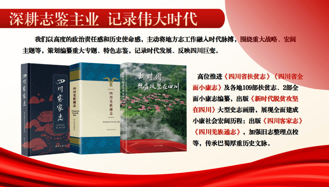(一)深耕志鉴主业,记录伟大时代。我们以高度的政治责任感和历史使命感,主动将地方志工作融入时代脉搏,围绕重大战略、宏阔主题等,策划编纂重大专题、特色志鉴,记录时代发展、反映四川巨变。我们高位推进《四川省扶贫志》《四川省全面小康志》及各地109部扶贫志、2部全面小康志编纂,出版《新时代脱贫攻坚在四川》大型史志画册,展现全面建成小康社会宏阔历程;出版《四川客家志》《四川羌族通志》,加强旧志整理点校等,传承巴蜀厚重历史文脉;编纂出版《四川年鉴》《四川省直部门(单位)大事记》,推进地方综合年鉴“一年一鉴公开出版、当年卷当年出版”,与重庆市地方志办、川渝两地发展改革委编纂《成渝地区双城经济圈建设年鉴》,系统呈现治蜀兴川年度成就;规划编纂乡镇(街道)、村(社区)志4390部,已出版918部,留存乡村文脉,服务乡村振兴;联合教育厅部署全省教育志鉴编纂,服务教育强省建设,各地编纂教育志鉴413部。