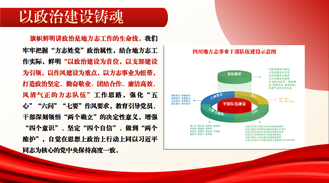 (一)以政治建设铸魂。旗帜鲜明讲政治是地方志工作的生命线。我们牢牢把握“方志姓党”政治属性,结合地方志工作实际,鲜明“以政治建设为首位,以支部建设为引领,以作风建设为重点,以方志事业为纽带,打造政治坚定、勤奋敬业、团结合作、廉洁高效、风清气正的方志队伍”工作思路,强化“五心”(静心、用心、细心、精心、耐心)“六问”(问自己的言行是否与单位发展目标相符,问自己是在为同事加油鼓劲还是扎针泄气,问自己是在积极出谋划策还是袖手旁观,问自己工作是积极作为还是消极被动,问自己是乐于担负重任还是推诿塞责,问自己负责的工作是否是自己最高能力水平的体现)“七要”(要谨小节、要慎交友、要戒贪欲、要知敬畏、要多谋事、要懂感恩、要明是非)作风要求,教育引导党员、干部深刻领悟“两个确立”的决定性意义,增强“四个意识”、坚定“四个自信”、做到“两个维护”,自觉在思想上政治上行动上同以习近平同志为核心的党中央保持高度一致。