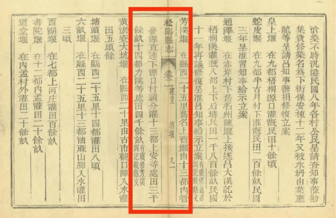 松古盆地是丽水市最大的盆地和重要的产粮区。松古灌区沿着松阴溪修建而成,为村民农业生产提供水利便利。松古灌区申请世界灌溉工程遗产工作启动后,松阳县史志部门深度参与申遗文本的地情文献和史料提供工作,从《处州府志》《松阳县志》《叶氏广远宗谱》《周氏宗谱》等方志文献中整理、辑录了松古灌区形成、演变和发展的相关记载,并按图索骥,进一步搜集到明清时期碑刻14方、摩崖2处、文选8篇等实物证据以及明天顺元年(1457)至清光绪九年(1883)的榜文18篇和古圳图1张。民国《松阳县志》记载芳溪堰、塘头堰、通泽堰等十余条堰渠,其中“芳溪堰,在县西二十五里,旧名上曹堰,由十三都内管发源,直达下源口村头,分灌十三都上安等处田三千余亩、十四都力溪等处田四千余亩。”这些珍贵资料对松古灌区自然山水、文化史迹、地方习俗等要素作了系统阐述,为书写松古灌区的“生命信息”、破译松古灌区的“遗传密码”提供了有力的史料支撑。