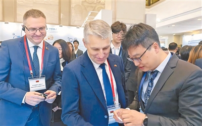 在无创血糖仪前,白俄罗斯驻上海总领事舍甫琴柯·亚历山大饶有兴致地体验了测量。用酒精消毒右手大鱼际,然后将手伸入仪器,短短两三分钟,屏幕上随即显示了两次测量结果并提供相应生活建议。他身旁的白俄罗斯驻华大使切尔维亚科夫不停追问:“检测原理是什么?采购价格是多少?对医护人员有何要求?”并当场索要了瑞金团队发表在《自然—代谢》杂志上的科学论文。