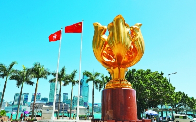 距培侨中学操场不到5公里的金紫荆广场上,五星红旗和紫荆花旗一起迎风飘扬,金色紫荆花雕塑格外耀眼。不远处,几座大厦顶端的LED大屏上,共同打出巨幅的国旗图像。