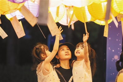 9月12日,浙江宁波月湖西广场,市民们在赏灯猜谜。沙燚杉摄(影像中国)