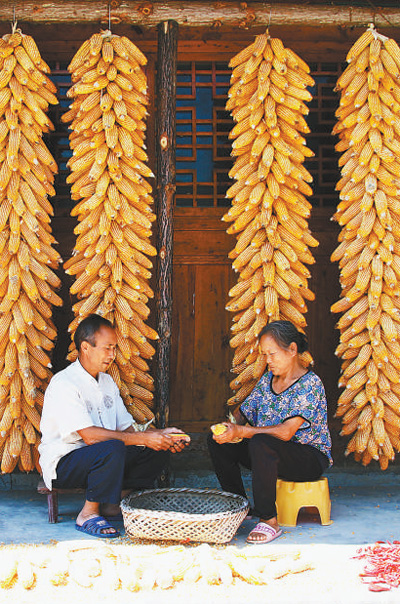9月13日,贵州省铜仁市印江土家族苗族自治县新寨镇泗塘村农民正在给丰收的玉米脱粒。左禹华摄(影像中国)