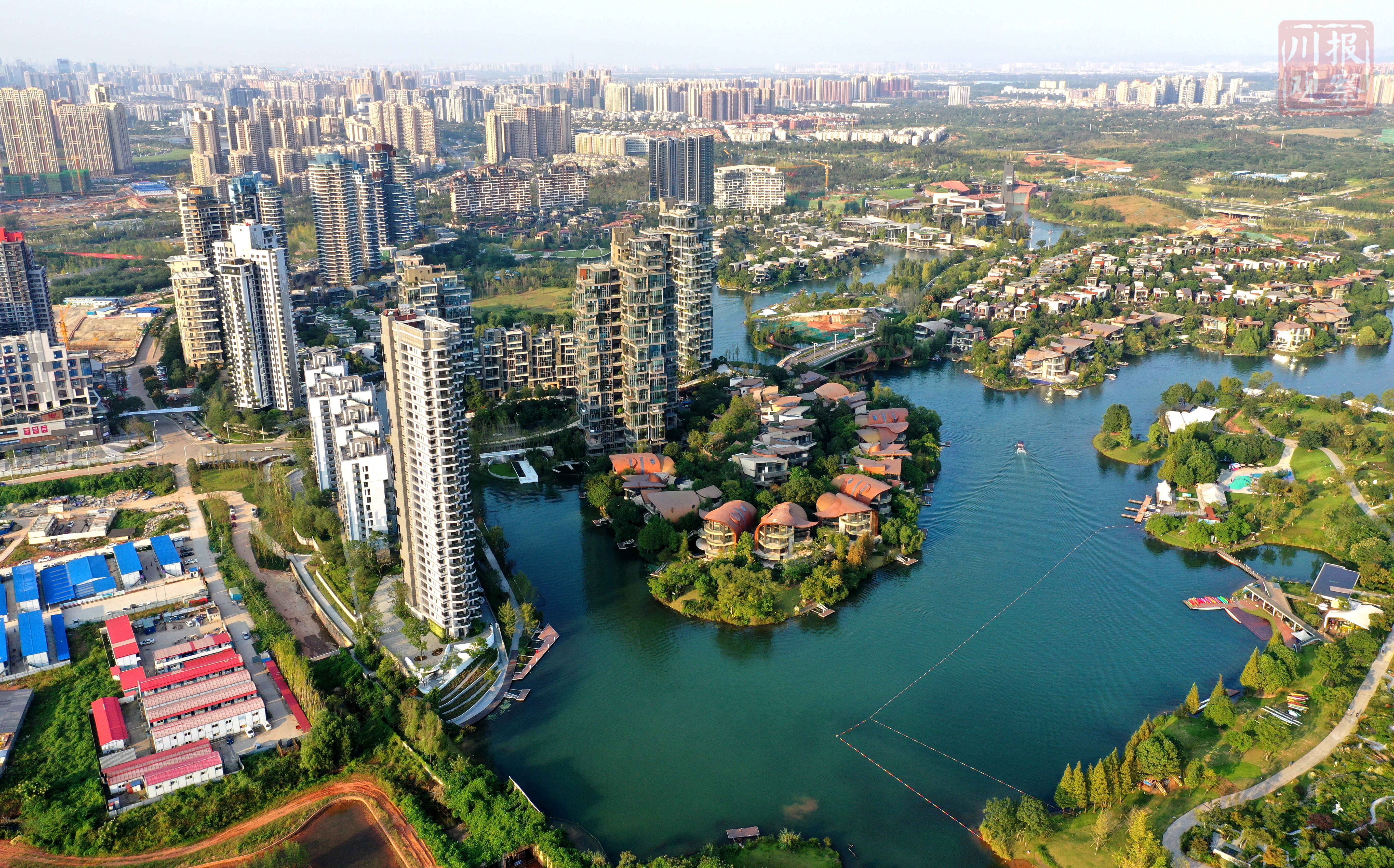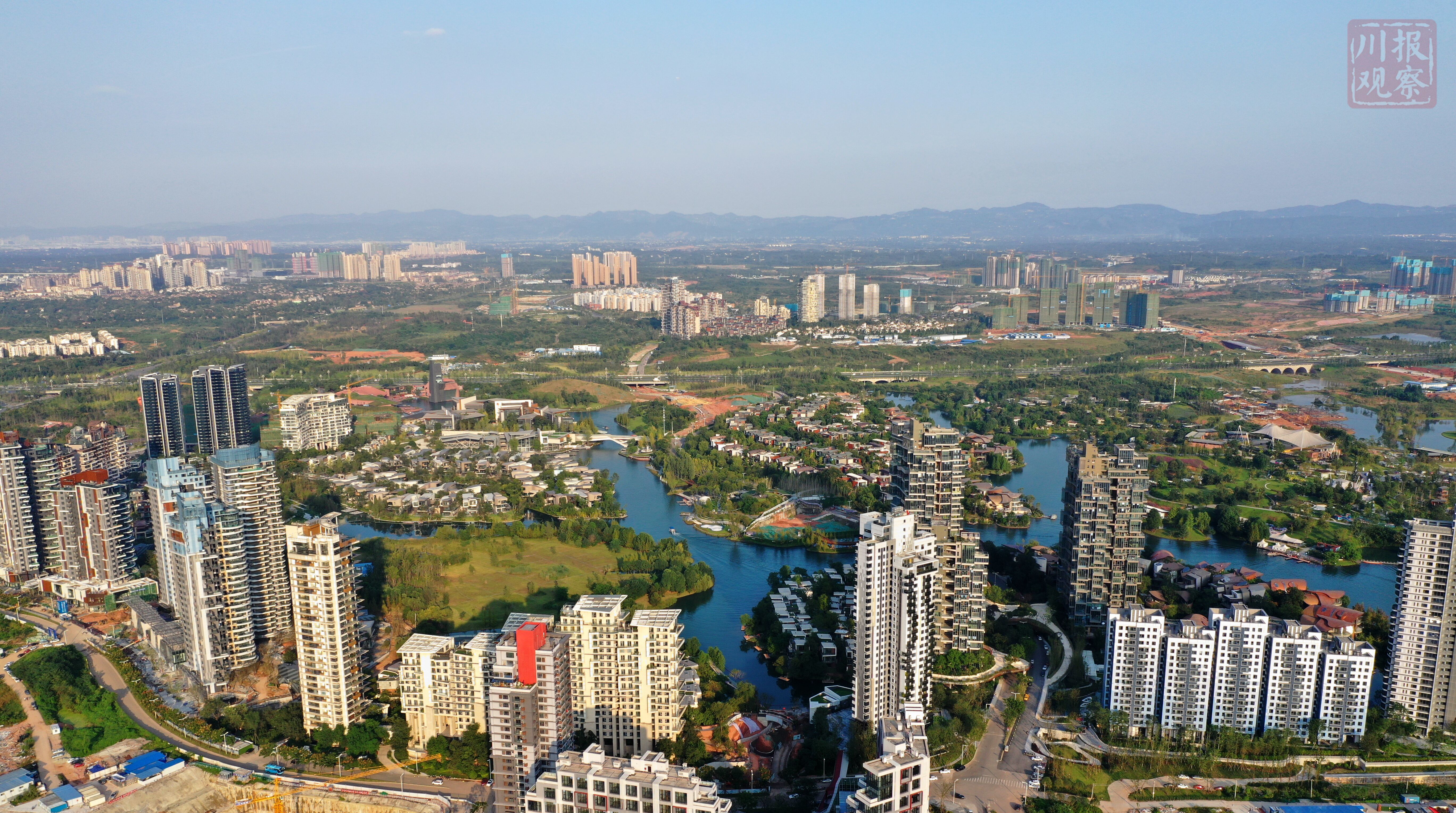 俯瞰成都天府新区,只见一栋栋高楼拔地而起,一条条大道联通四方,一处处公园游人如织,远处的龙泉山脉肉眼可见,在晚霞的照耀下美轮美奂!(川报观察记者 李向雨)