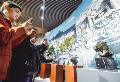 11月13日,观众在“回归之路——新中国成立70周年流失文物回归成果展”上参观圆明园马首铜像(右)。新华社发