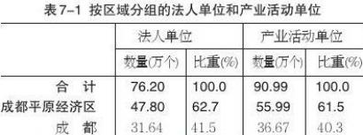 在第二产业和第三产业法人单位中,位居前三位的地区是:成都市31.64万个,占41.5%;绵阳市4.74万个,占6.2%;南充市3.90万个,占5.1%。