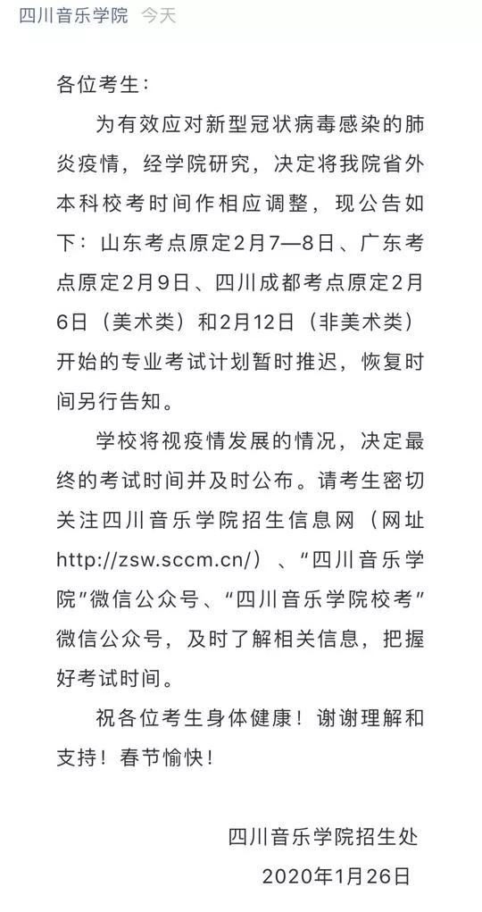 四川音乐学院省外本科校考时间作相应调整,公告如下:山东考点原定2月7—8日、广东考点原定2月9日、四川成都考点原定2月6日(美术类)和2月12日(非美术类)开始的专业考试计划暂时推迟,恢复时间另行告知。