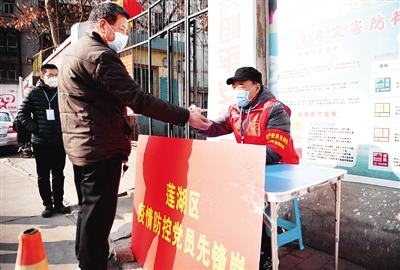陕西省西安市唐都花园社区的党员志愿者(右一)在社区门前为居民测量体温。新华社发