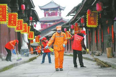 3月14日,蓬安新时代文明实践中心志愿者在周子古镇参加我省爱国卫生运动“周末卫生大扫除”活动。 郭安平 摄(视觉四川)