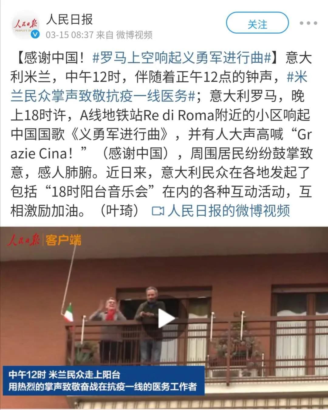 意大利米兰,中午12时,伴随着正午12点的钟声,米兰民众走上阳台,用热烈的掌声致敬奋战在抗疫一线的医务工作者;意大利罗马,晚上18时许,A线地铁站Re di Roma附近的小区响起中国国歌《义勇军进行曲》,并有人大声高喊“Grazie Cina!”(感谢中国),周围居民纷纷鼓掌致意,感人肺腑。