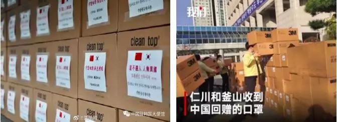 3月11日,中国政府向韩方提供的110万只口罩等物资援助中,首批8万只N95口罩和1万套医用防护服抵达仁川机场。此前上海市、威海市、南京市、绍兴市政府已向韩国陆续捐赠大批口罩及防护服、护目镜等其他医疗物资。