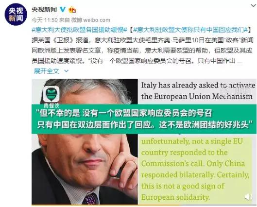 之前,有人说疫情的来临就像是一场全球大考,目前中国已与全球100多个国家、十多个国际和地区组织分享技术文件和诊疗方案,开展20多次技术交流,并派出专家组赴海外提供支持。意大利驻欧盟大使毛里齐奥·马萨里10日在美国“政客”新闻网上发表署名文章:疫情当前,意大利需要欧盟的帮助“没有一个欧盟国家响应委员会的号召,只有中国作出回应”。今天中国1000台肺呼吸机、10万套高科技口罩、2万套防护服、5万个检测盒......已抵达意大利,中方医疗救援队也整装待发。