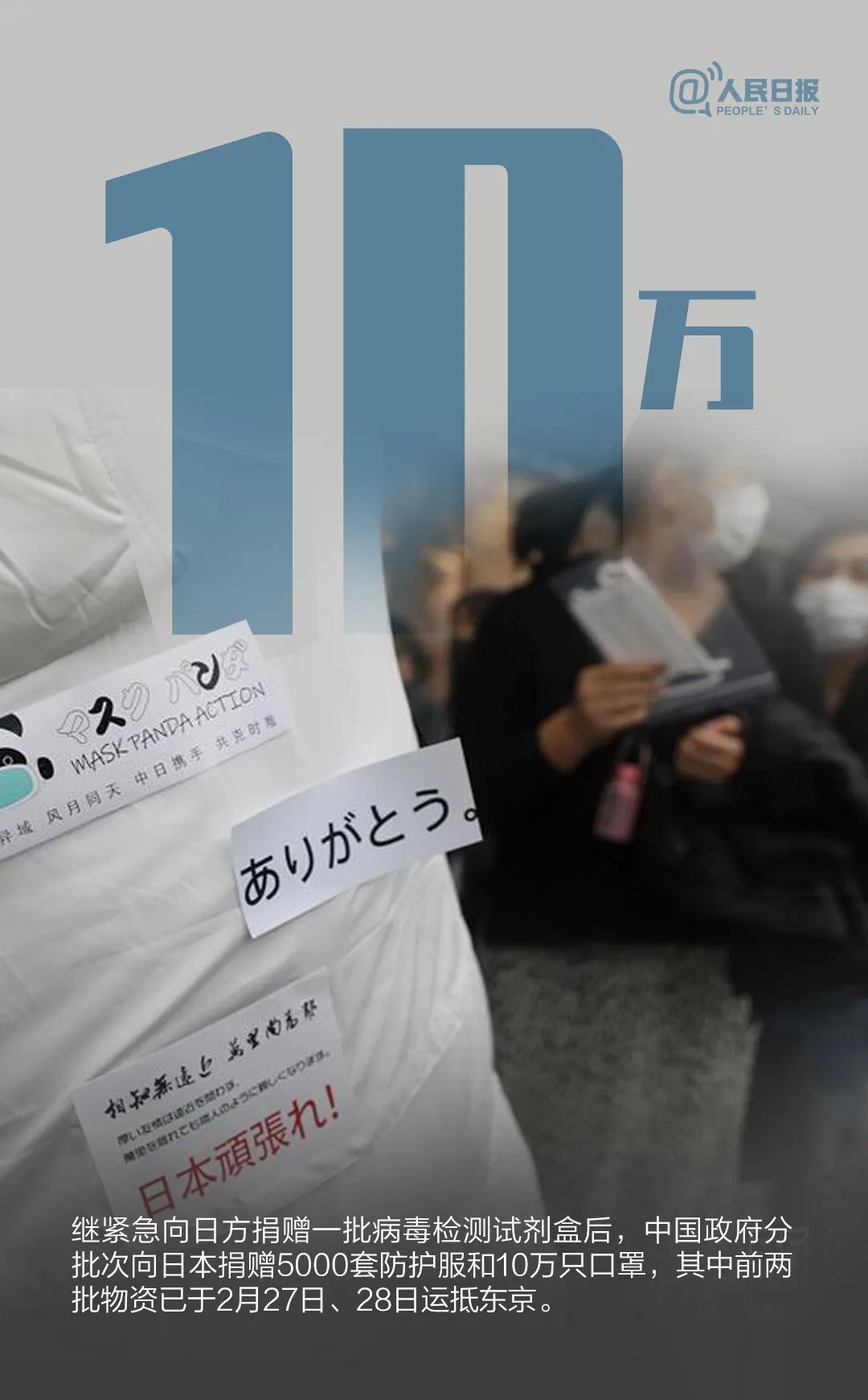 2月20日,中国捐赠日本厚生劳动省1.25万只核酸检测试剂盒。2月29日,中国继续向日本捐赠5000套防护服和10万只口罩。除此以外很多中国地方省市、企业和个人也在积极行动,向日本捐款捐物,为日本加油打气。