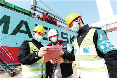 近日,浙江省舟山市岱山县公安局秀山派出所民警深入辖区常石集团(舟山)造船有限公司,为工人们开展防疫普法宣传活动。邹训永摄/光明图片