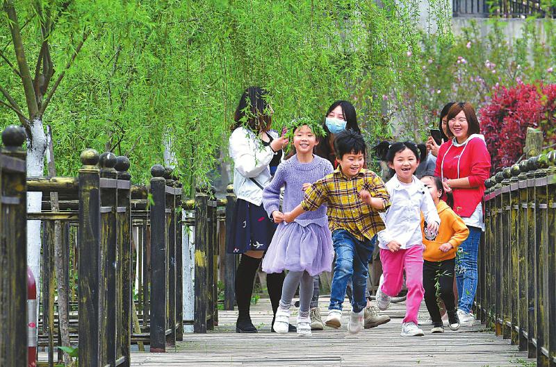 南充市近郊游的“打卡地”——嘉陵区世阳镇过脚垭村,一群孩子迎着春风,在柳条间追逐嬉戏。 余中华 摄(视觉四川)