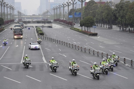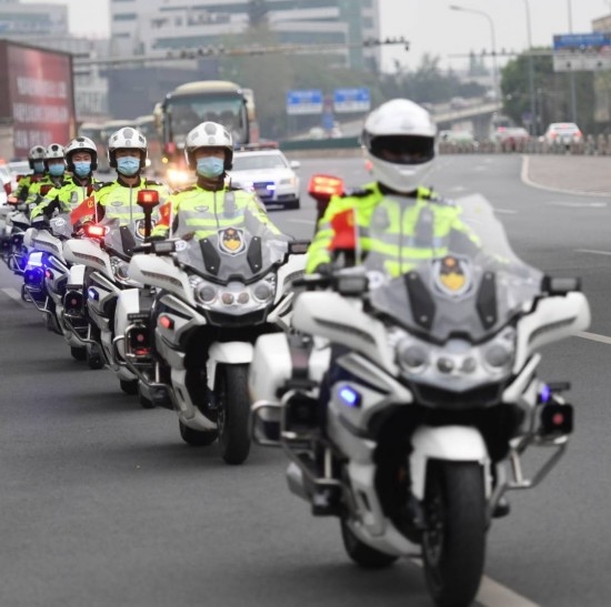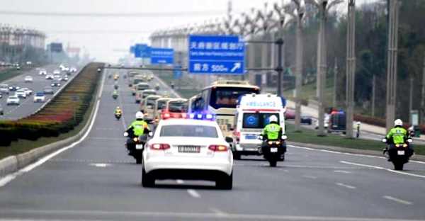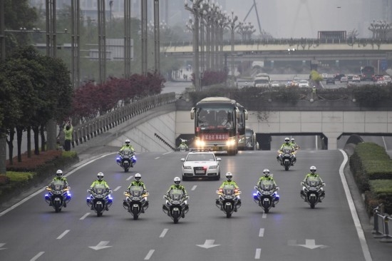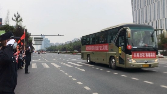 4月7日下午4点20分,伴随着歌曲《我爱你中国》的旋律,12辆大巴车载着医疗队员们从双流机场出发,前往黑龙滩。6辆警用摩托车、2辆警车灯光闪烁,在前方护送车队缓缓驶离。