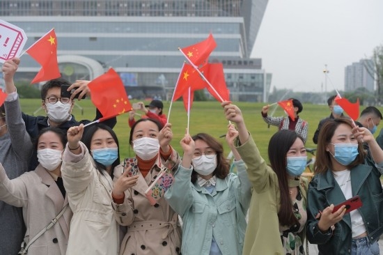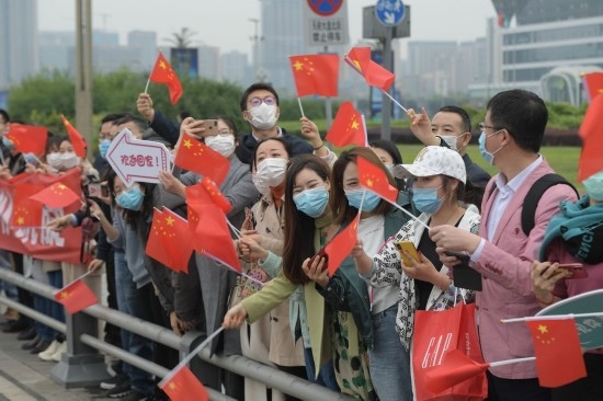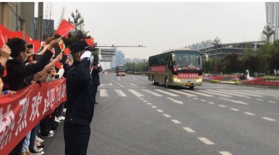 4月7日下午4点43分,环球中心正门外,四川省援助湖北医疗队队员乘坐的车队路过这里,现场自发聚集的上百名群众挥舞着国旗,高喊着“欢迎回家,英雄凯旋”,用这种热烈的仪式,欢迎援鄂医疗队队员回家。