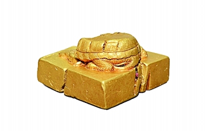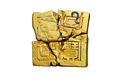 印台边长10厘米,厚3厘米,重达十多斤,含金量高达95%。方形印台、龟形印纽,印面铸有“蜀世子宝”四字。印已破碎成4块,印上的龟形头部暂未发现。