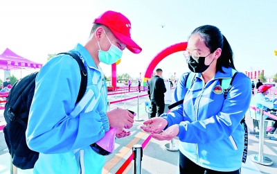 近日,甘肃各级各类学校分批次开学复课。图为青年志愿者在学校门口给同学进行消毒。 新华社发