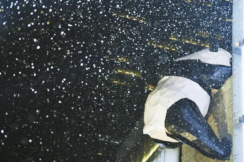 1月7日晚,成都IFS的爬楼大熊猫被飞舞的雪花包裹。四川日报全媒体记者杨树摄