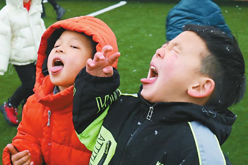 1月7日,在成都这场全民耍雪的“盛况”里,十七幼的萌娃解锁了最萌赏雪姿势——张嘴接雪。图片由学校提供