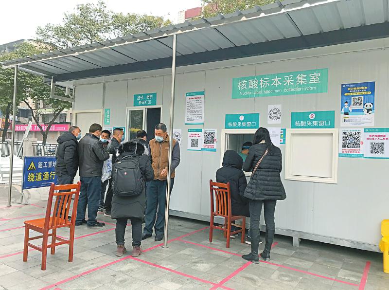 广元市中心医院核酸检测采样点前,不少人在等着做检测。 四川日报全媒体记者燕巧摄