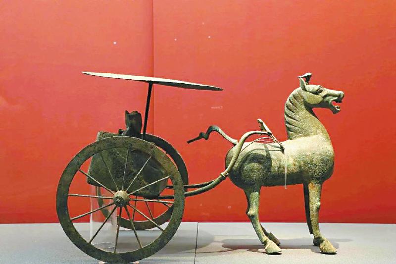 汉代文人和工匠也开始用不同形式塑造着汉马形象。展品中有来自甘肃省博物馆的执戟铜骑士、铜轺车等,展示了汉马的健美体魄,以及在汉代的广泛普及。