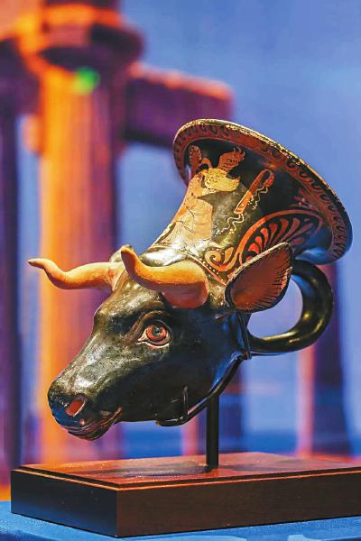 另一件牛头形红彩陶酒壶,整体形状是一头黑色公牛的头部。外层的涂料含有较多的铁,因此散发出金属的光泽。酒壶采用红绘技法,描绘希腊神话中的著名场景:变身为天鹅的宙斯,正在诱惑绝世美女丽达。
