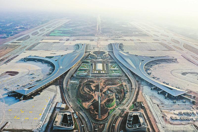 图为2月5日,航拍的成都天府国际机场,T1和T2航站楼如一对金色的翅膀展现在眼前。 四川日报全媒体记者何海洋摄