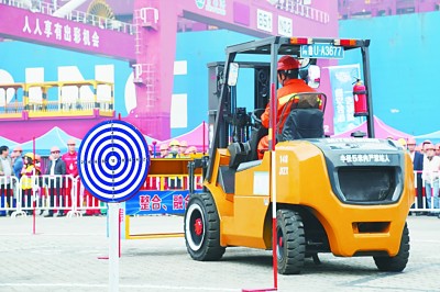 山东港口技术安全赛场上,选手在进行叉车竞赛。新华社发