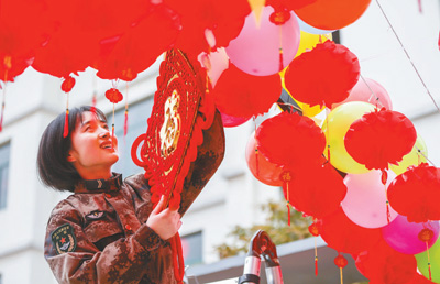2月10日,第72集团军某旅整个营区内张灯结彩。图为女兵在挂福字。刘自华摄(影像中国)