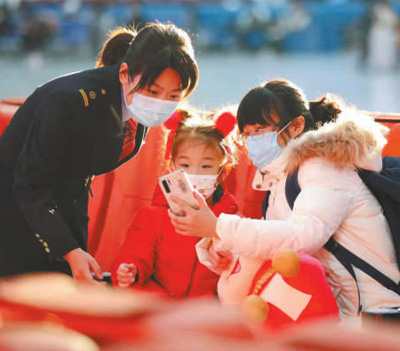 2月9日,中国铁路沈阳局集团公司长春站工作人员在解答旅客问询。王英建摄(人民视觉)