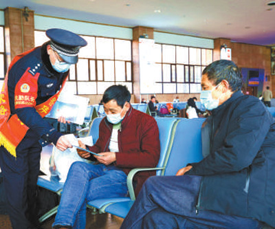 春节假期,太原铁路公安处民警为旅客提供周到服务,让旅客有更好的出行体验。图为民警在发放安全出行注意事项等宣传品。赵 彤摄(影像中国)